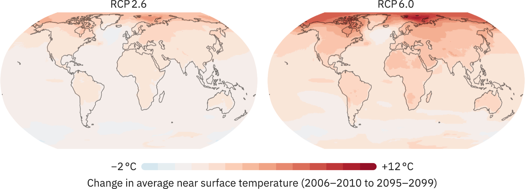 The above plot shows the warming in near surface temperatures from 2006–2010 to 2095–2099 for two different emissions scenarios: RCP 2.6 and RCP 6.0. As you can see: the overall temperature is going to rise, and the increase is far more severe in RCP 6.0. It can also be seen that the warming varies between regions, with highest warming occuring in the Northern latitudes.