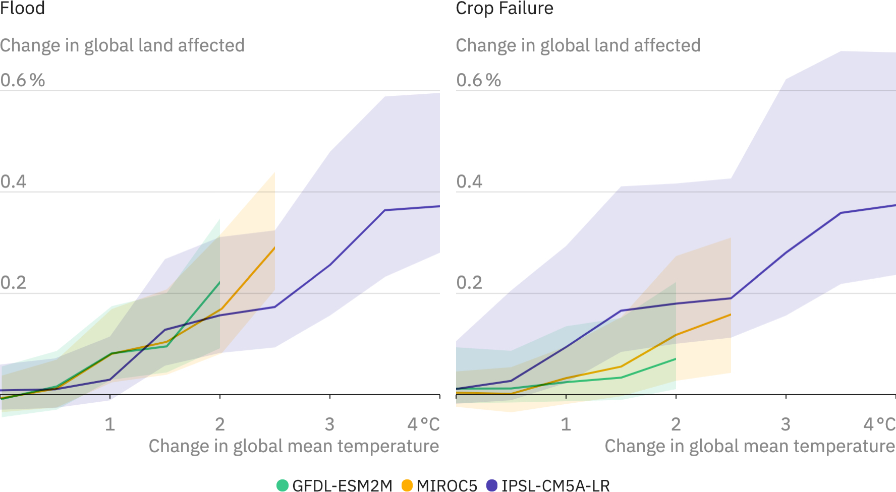 The charts above show simulation analyses of impact simulations for two sectors, floods, and crop failure. In particular, the change in the percentage of the global surface that is affected by extreme event when compared to preindustrial times, is shown. In each case, climate data from three different global climate models (GFDL-ESM2M, MIROC5, and IPSL-CM5A-LR) were used to drive the impact models – each color relates to results using data from a different climate model. The thick lines depict the median of the ensemble for all impact models considered. The shaded areas show the 20th to 80th percentile of that ensemble and thus give a feel of the model spread.