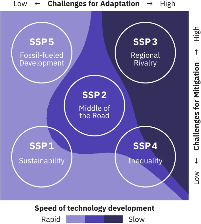 - Socioeconomic scenarios in climate change research are increasingly based on the Shared Socioeconomic Pathways (SSPs) which represent five different futures with widely varying challenges to mitigation and adaptation.