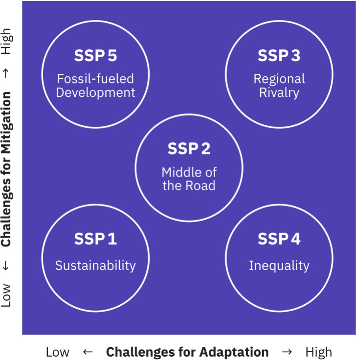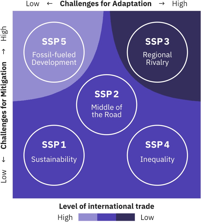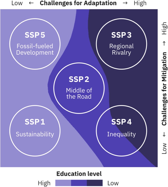 - Socioeconomic scenarios in climate change research are increasingly based on the Shared Socioeconomic Pathways (SSPs) which represent five different futures with widely varying challenges to mitigation and adaptation.